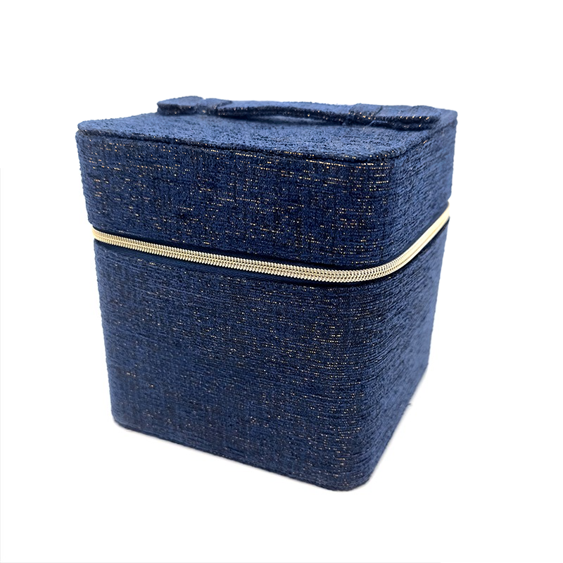 Crafted with premium textured fabric in a rich dual-tone finish—deep navy woven with subtle golden threads—it catches the light with a soft, luxe shimmer, adding a touch of quiet glamour to any vanity or hotel counter. The structured square silhouette keeps all your essentials neatly contained, while the smooth gold-toned zipper ensures secure closure and easy access to your favorite makeup, skincare, and jewelry pieces.