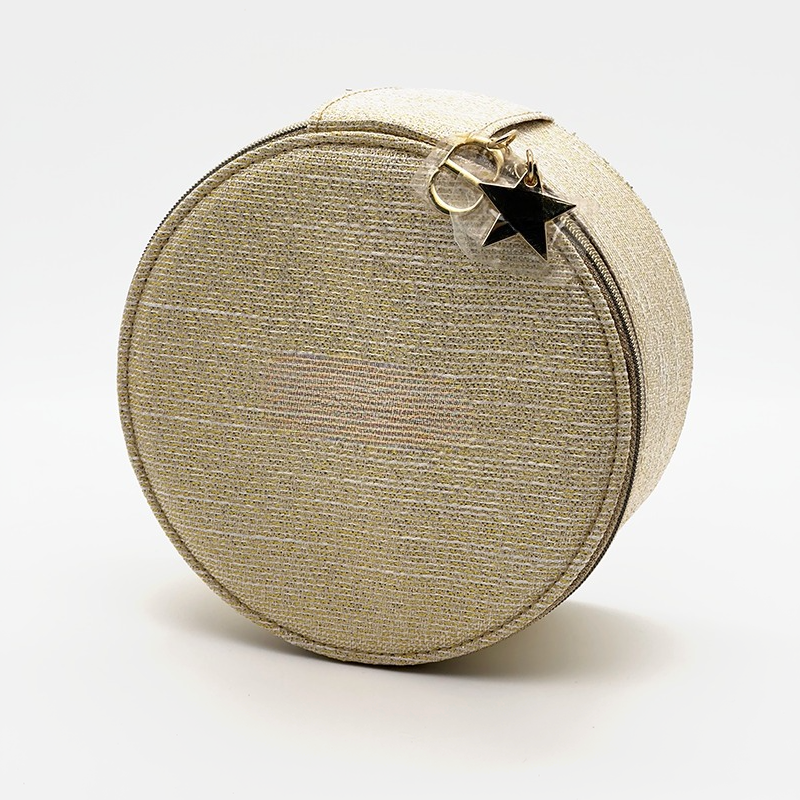 Keep your jewelry safe and stylish with this elegant round jewelry box. Crafted from shimmering gold fabric, it features a built-in mirror in the lid for quick touch-ups on the go.