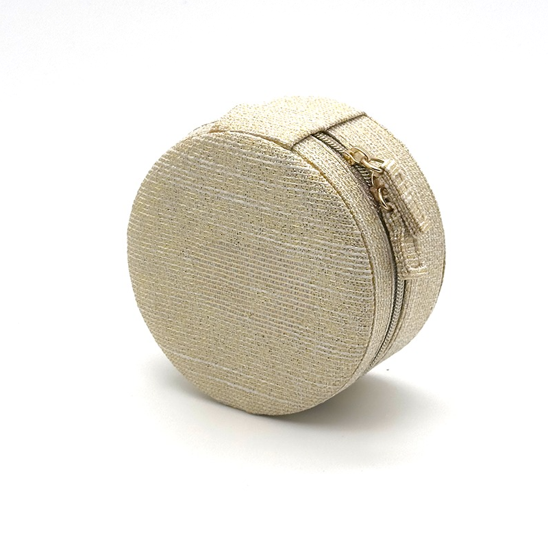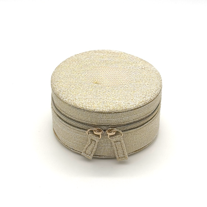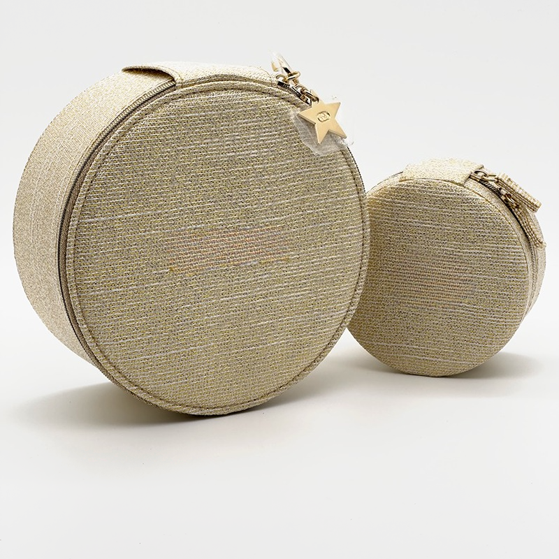 Keep your rings, earrings, and necklaces safe and organized with this elegant round jewelry box. Crafted from shimmering gold fabric, it adds a touch of luxury to your storage routine.